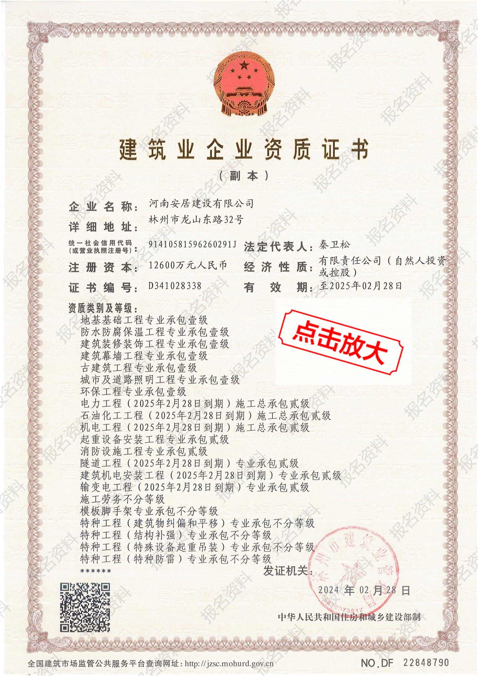 滔滔黃河哺育了中華民族拼搏向上的奮斗精神,巍巍太行造就了中原兒女的紅旗渠精神。百萬(wàn)林州人下太行,鑄就了中國(guó)建筑之鄉(xiāng)響當(dāng)當(dāng)?shù)囊燮放?。河南安居建設(shè)有限公司從誕生起血液里就流淌著紅色基因,秉承“安得廣夏千萬(wàn)間,大庇天下寒士俱歡顏”的擔(dān)當(dāng)精神,用鋼筋混凝土筑起了高樓大廈,也用一流品質(zhì)、家國(guó)情懷打造了安居建設(shè)的輝煌成績(jī)。公司成立于2012年,注冊(cè)資金12600萬(wàn)元,公司成立至今,擁有建筑,市政施工總承包等十項(xiàng)一級(jí)資質(zhì);其他二級(jí)等資質(zhì)共二十余項(xiàng)。公司秉承質(zhì)量第一,服務(wù)為主,堅(jiān)持垂直管理,從不設(shè)立分公司等分支機(jī)構(gòu)。